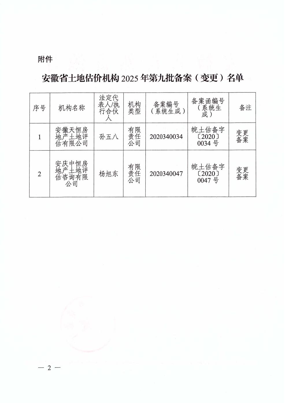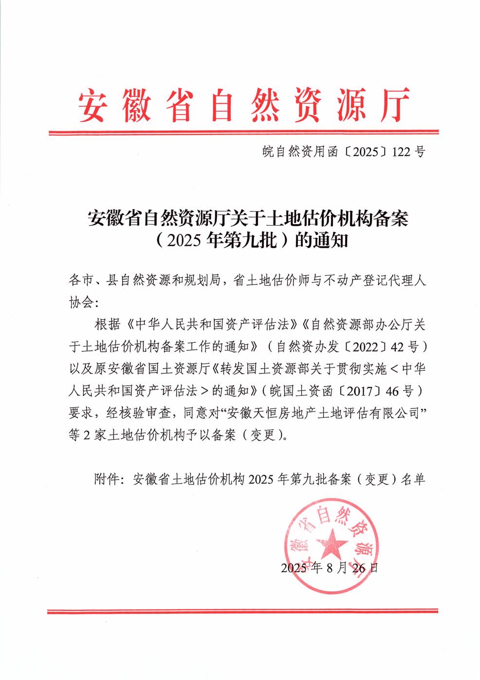 安徽省自然资源厅关于土地估价机构备案(2025年第九批)的通知