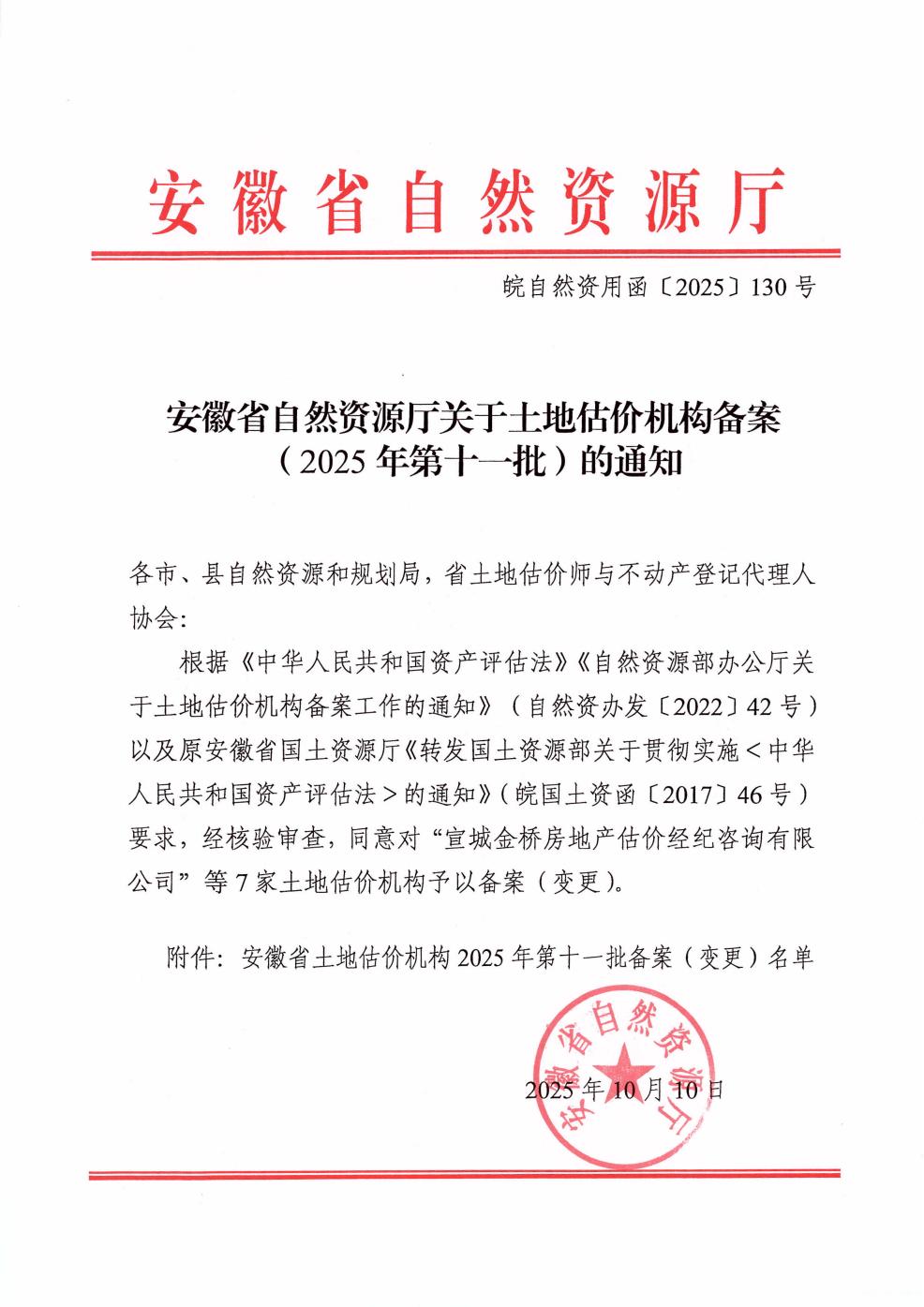 安徽省自然资源厅关于土地估价机构备案(2025年第十一批)的通知