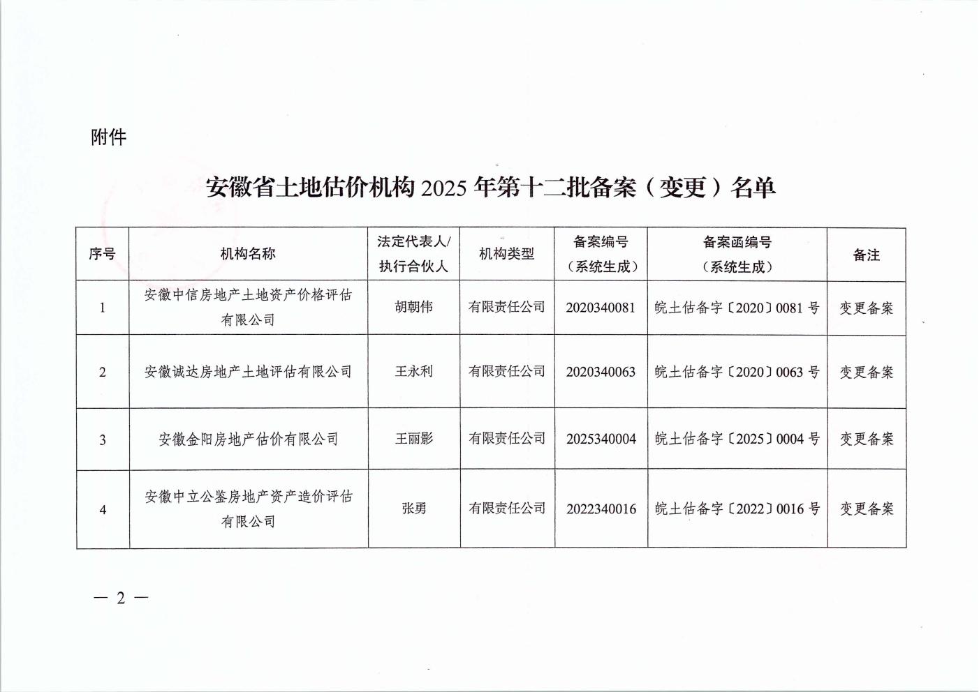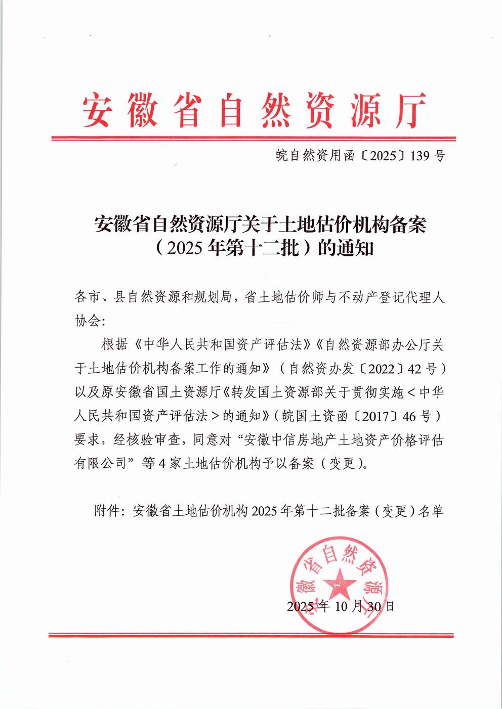 安徽省自然资源厅关于土地估价机构备案(2025年第十二批)的通知