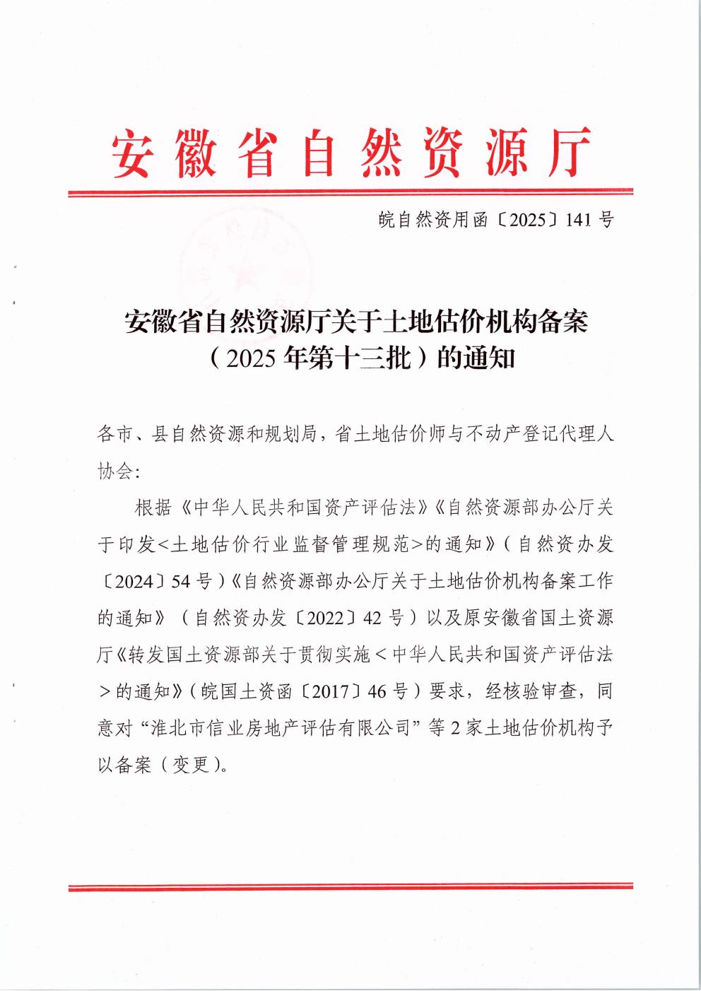 安徽省自然资源厅关于土地估价机构备案(2025年第十三批)的通知