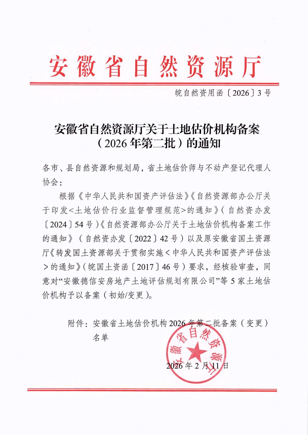 安徽省自然资源厅关于土地估价机构备案(2026年第二批)的通知