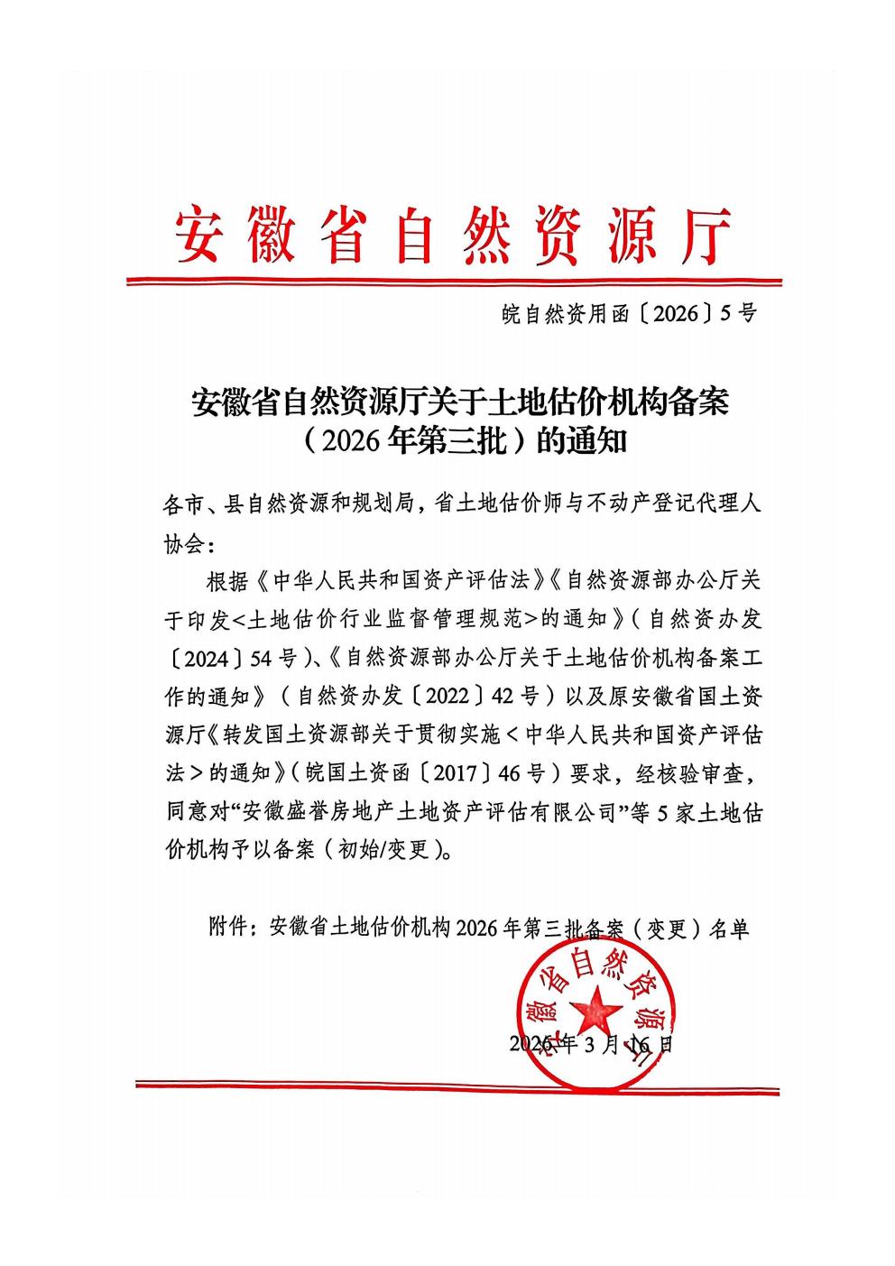 安徽省自然资源厅关于土地估价机构备案(2026年第三批)的通知